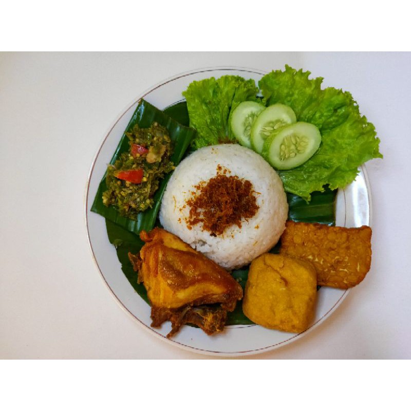 ayam goreng + nasi + tahu tempe + lalapan + sambal merah